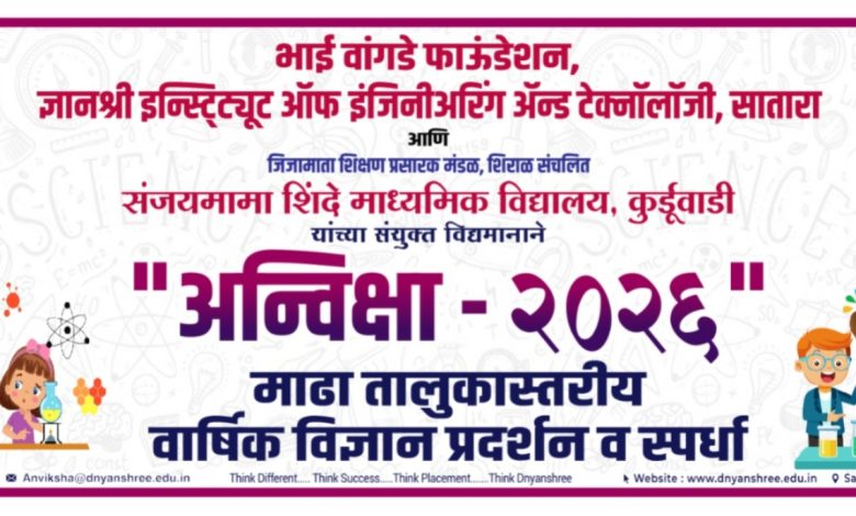कुर्डूवाडी: दि. ०२/ माढा येथे तालुकास्तरीय विज्ञान प्रदर्शनाचे आयोजन करण्यात आले आहे. भाई फाउंडेशन ज्ञानश्री इन्स्टिट्यूट ऑफ इंजिनिअरिंग कॉलेज सातारा व संजयमामा शिंदे माध्यमिक विद्यालय कुर्डूवाडी यांच्या संयुक्त विद्यमाने आयोध्याश्री मंगल कार्यालय कुर्डूवाडी येथे दिनांक 5 जानेवारी सकाळी 9 वाजता माढा तालुकास्तरीय विज्ञान प्रदर्शनाचे आयोजन करण्यात आले आहे.