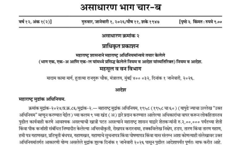 मुख्यमंत्री आदरणीय देवेंद्रजी फडणवीस यांच्या नेतृत्वात महायुती सरकारने शेतकरी हिताचा महत्त्वाचा आणि दिलासादायक निर्णय घेतला. एक जानेवारी २०२६ पासून बँकेकडून २ लाखांपर्यंत पीक कर्ज घेताना लागणारे संपूर्ण तारण शुल्क शेतकऱ्यांसाठी माफ करण्यात आले. राजपत्र जारी झाले आहे.